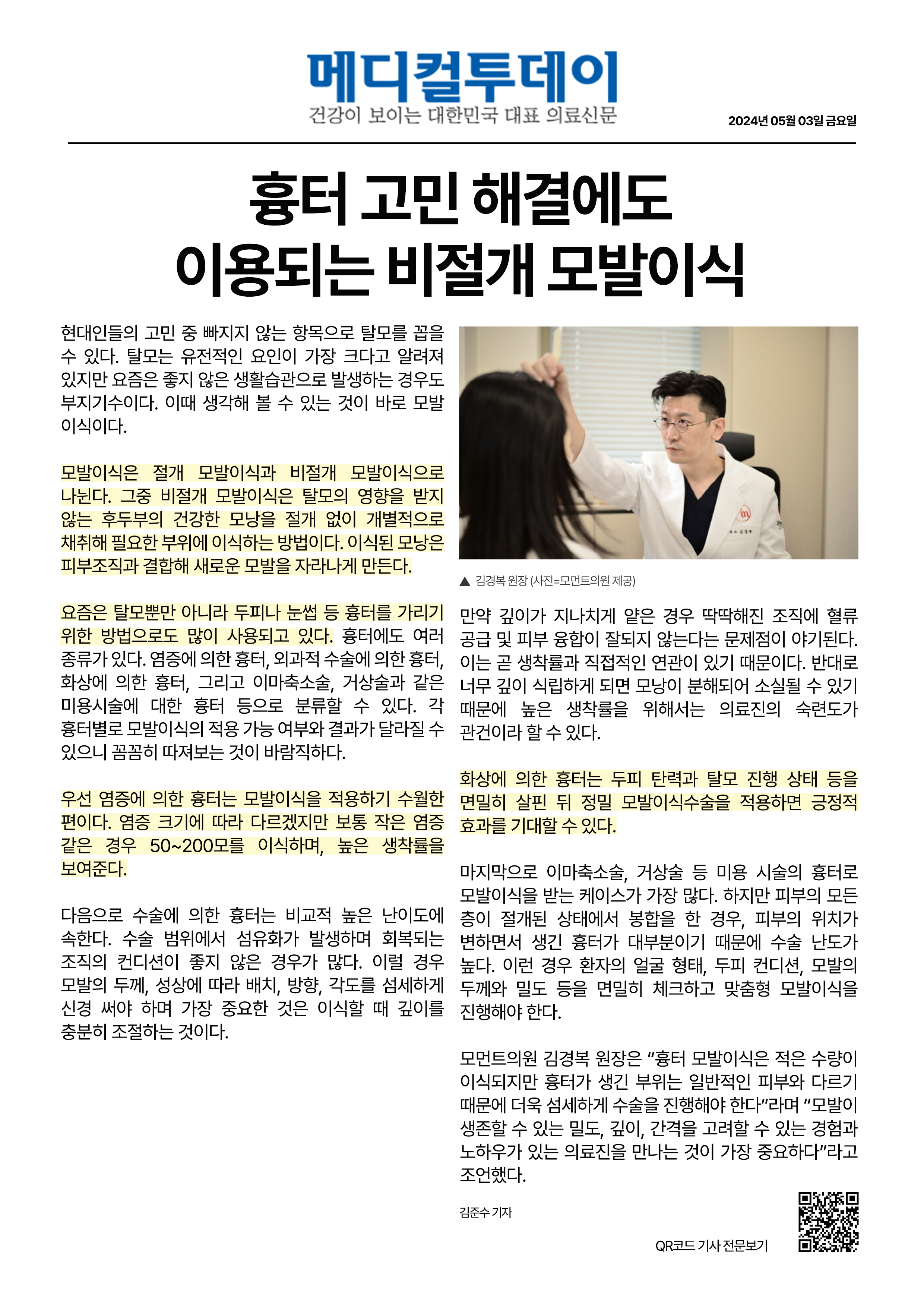 모먼트의원 김경복 원장은 “흉터 모발이식은 적은 수량이 이식되지만 흉터가 생긴 부위는 일반적인 피부와 다르기 때문에 더욱 섬세하게 수술을 진행해야 한다”라며 “모발이 생존할 수 있는 밀도, 깊이, 간격을 고려할 수 있는 경험과 노하우가 있는 의료진을 만나는 것이 가장 중요하다”라고 조언했다.