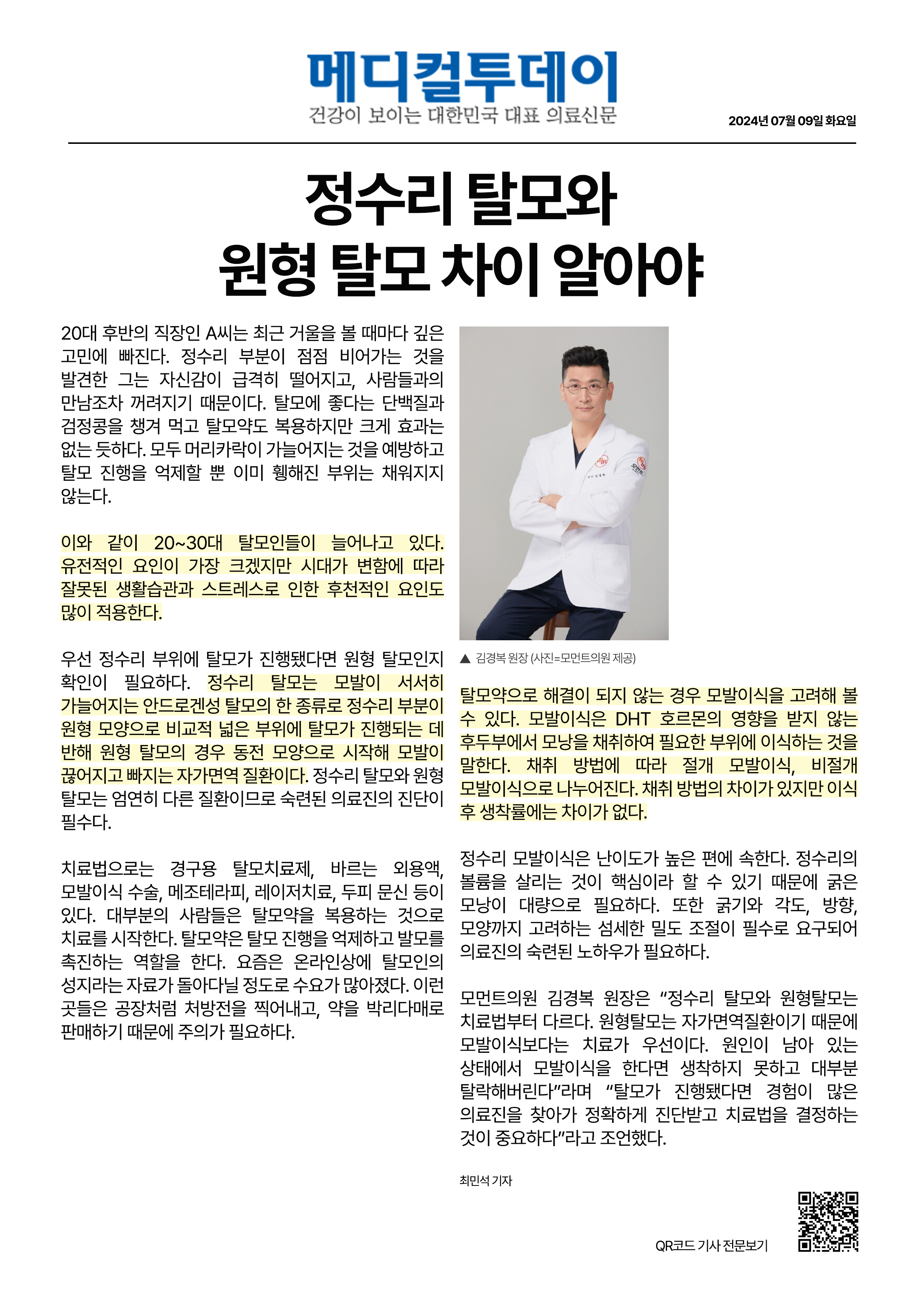 모먼트의원 김경복 원장은 “정수리 탈모와 원형탈모는 치료법부터 다르다. 원형탈모는 자가면역질환이기 때문에 모발이식보다는 치료가 우선이다. 원인이 남아 있는 상태에서 모발이식을 한다면 생착하지 못하고 대부분 탈락해버린다”라며 “탈모가 진행됐다면 경험이 많은 의료진을 찾아가 정확하게 진단받고 치료법을 결정하는 것이 중요하다”라고 조언했다.