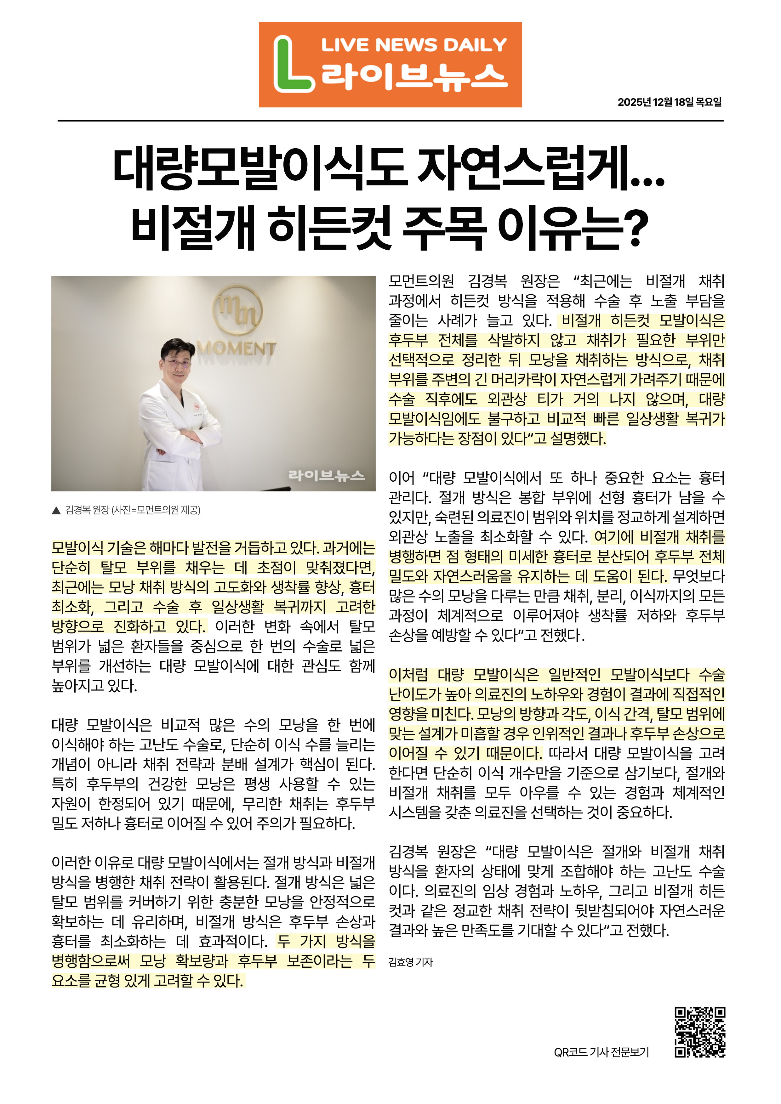 김경복 원장은 “대량 모발이식은 절개와 비절개 채취 방식을 환자의 상태에 맞게 조합해야 하는 고난도 수술이다. 의료진의 임상 경험과 노하우, 그리고 비절개 히든컷과 같은 정교한 채취 전략이 뒷받침되어야 자연스러운 결과와 높은 만족도를 기대할 수 있다”고 전했다.