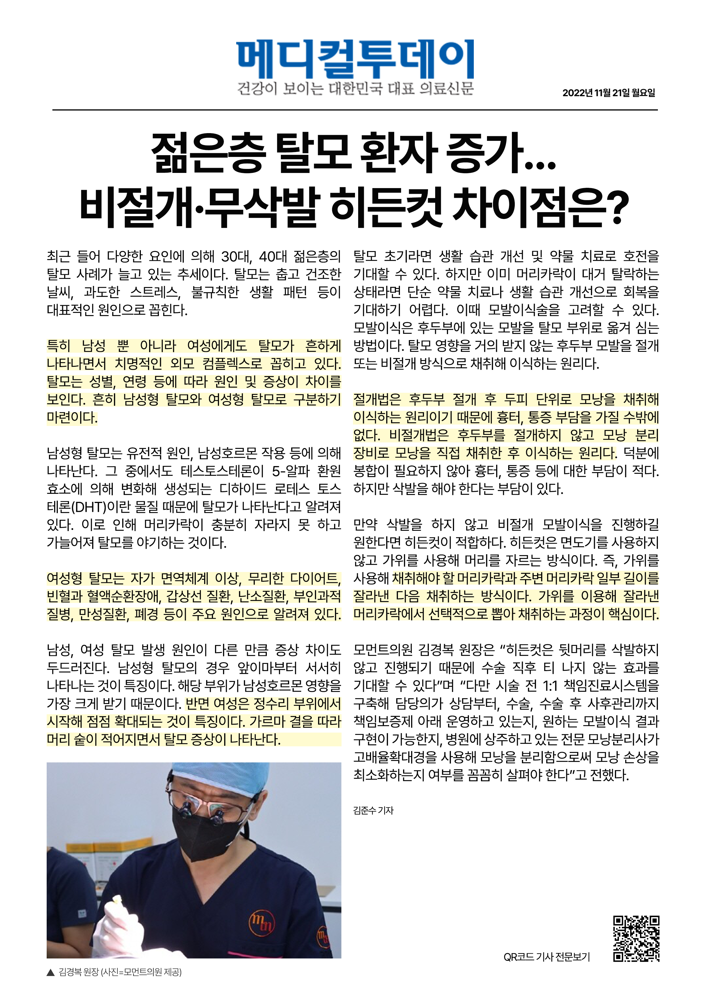 [메디컬투데이=김준수 기자] 최근 들어 다양한 요인에 의해 30대, 40대 젊은층의 탈모 사례가 늘고 있는 추세이다. 탈모는 춥고 건조한 날씨, 과도한 스트레스, 불규칙한 생활 패턴 등이 대표적인 원인으로 꼽힌다.