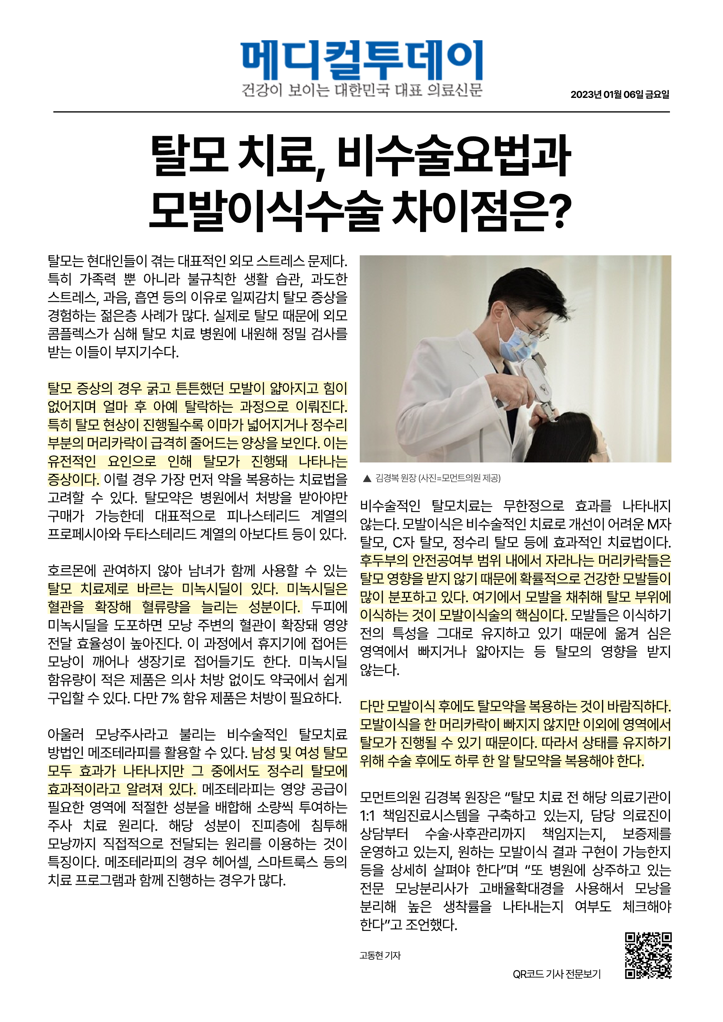 모먼트의원 김경복 원장은 “탈모 치료 전 해당 의료기관이 1:1 책임진료시스템을 구축하고 있는지, 담당 의료진이 상담부터 수술·사후관리까지 책임지는지, 보증제를 운영하고 있는지, 원하는 모발이식 결과 구현이 가능한지 등을 상세히 살펴야 한다”며 “또 병원에 상주하고 있는 전문 모낭분리사가 고배율확대경을 사용해서 모낭을 분리해 높은 생착률을 나타내는지 여부도 체크해야 한다”고 조언했다.