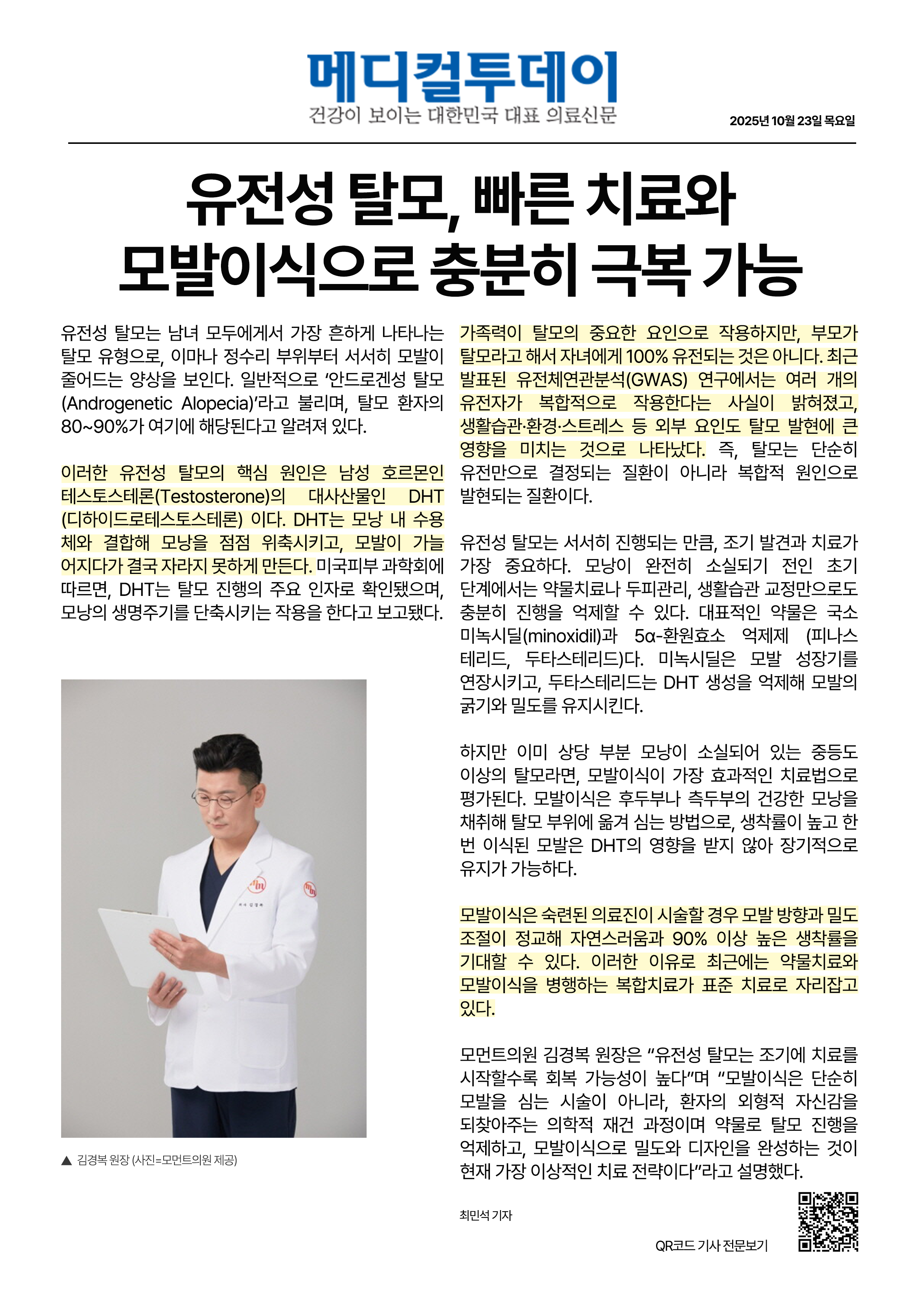 모먼트의원 김경복 원장은 “유전성 탈모는 조기에 치료를 시작할수록 회복 가능성이 높다”며 “모발이식은 단순히 모발을 심는 시술이 아니라, 환자의 외형적 자신감을 되찾아주는 의학적 재건 과정이며 약물로 탈모 진행을 억제하고, 모발이식으로 밀도와 디자인을 완성하는 것이 현재 가장 이상적인 치료 전략이다”라고 설명했다.