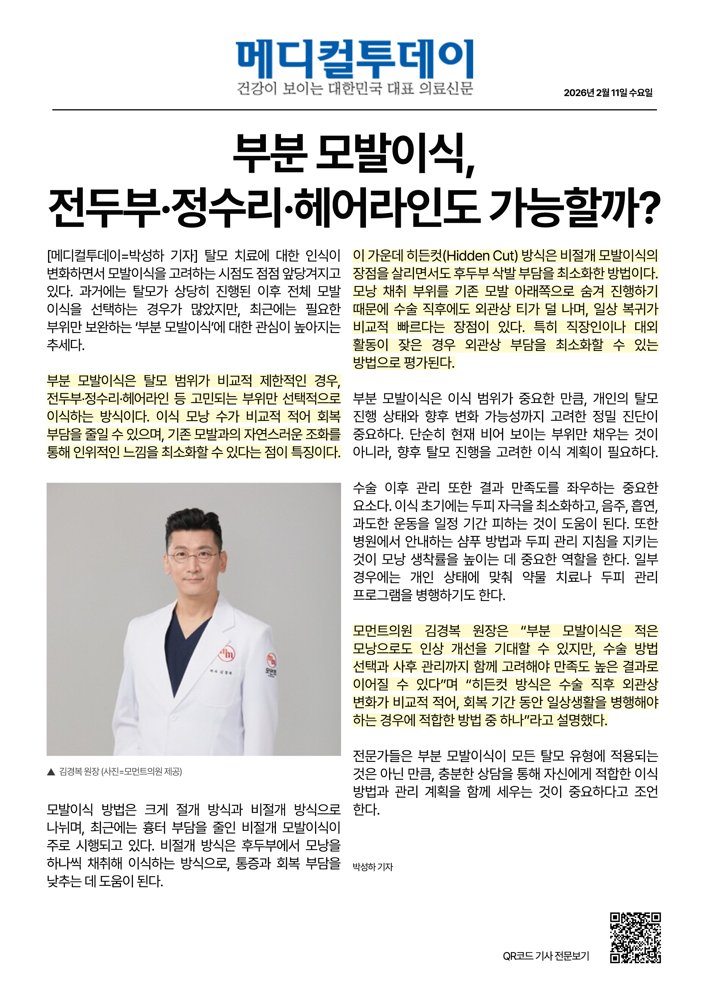 모먼트의원 김경복 원장은 “부분 모발이식은 적은 모낭으로도 인상 개선을 기대할 수 있지만, 수술 방법 선택과 사후 관리까지 함께 고려해야 만족도 높은 결과로 이어질 수 있다”며 “히든컷 방식은 수술 직후 외관상 변화가 비교적 적어, 회복 기간 동안 일상생활을 병행해야 하는 경우에 적합한 방법 중 하나”라고 설명했다.