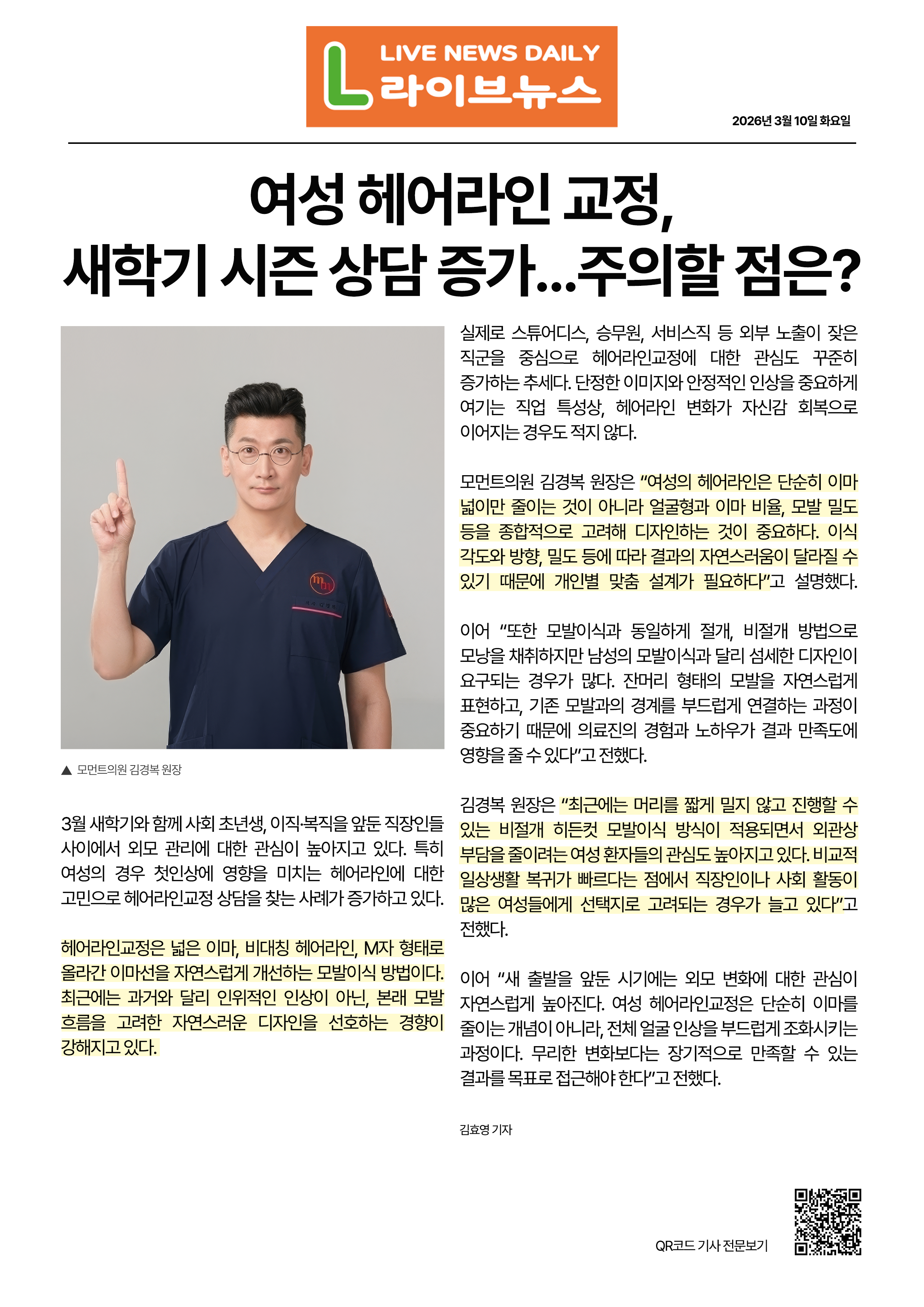 이어 “새 출발을 앞둔 시기에는 외모 변화에 대한 관심이 자연스럽게 높아진다. 여성 헤어라인교정은 단순히 이마를 줄이는 개념이 아니라, 전체 얼굴 인상을 부드럽게 조화시키는 과정이다. 무리한 변화보다는 장기적으로 만족할 수 있는 결과를 목표로 접근해야 한다”고 전했다.